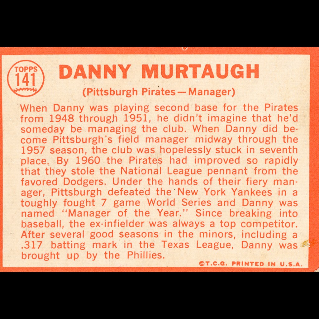 “When Danny was playing second base for the Pirates from 1948 through 1951 he didn’t imagine he’d someday be managing the club. When Danny did become Pittsburgh’s field manager midway through the 1957 season, the club was hopelessly stuck in seventh place. By 1960 the Pirates had improved so rapidly that they store the National League pennant from the favored Dodgers. Under the hands of their fiery manager, Pittsburgh defeated the New York Yankees in a toughly fought 7 game World Series and Danny was named “Manager of the Year.” Since breaking into baseball, the ex-infielder was always a top competitor. After several good seasons in the minors, including a .317 batting mark in the Texas League, Danny was brought up by the Phillies.”